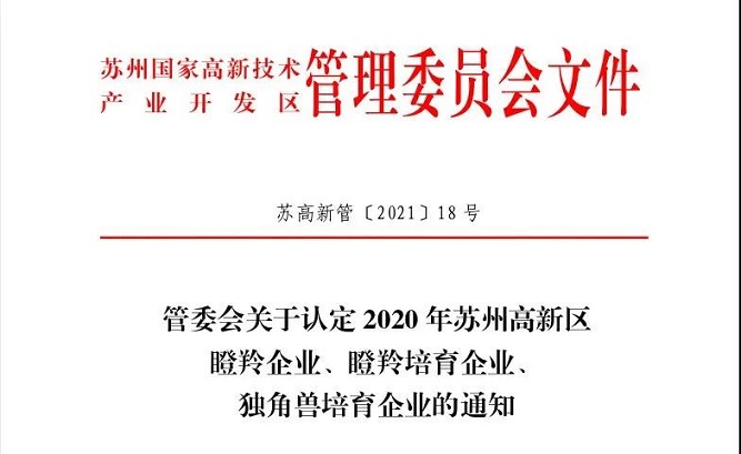 近日,苏州高新区管委会发布了2020年瞪羚企业、瞪羚培育企业、独角兽培育企业认定企业名单。澳门永利博彩公司网站荣获苏州高新区六家独角兽培育企业之一。