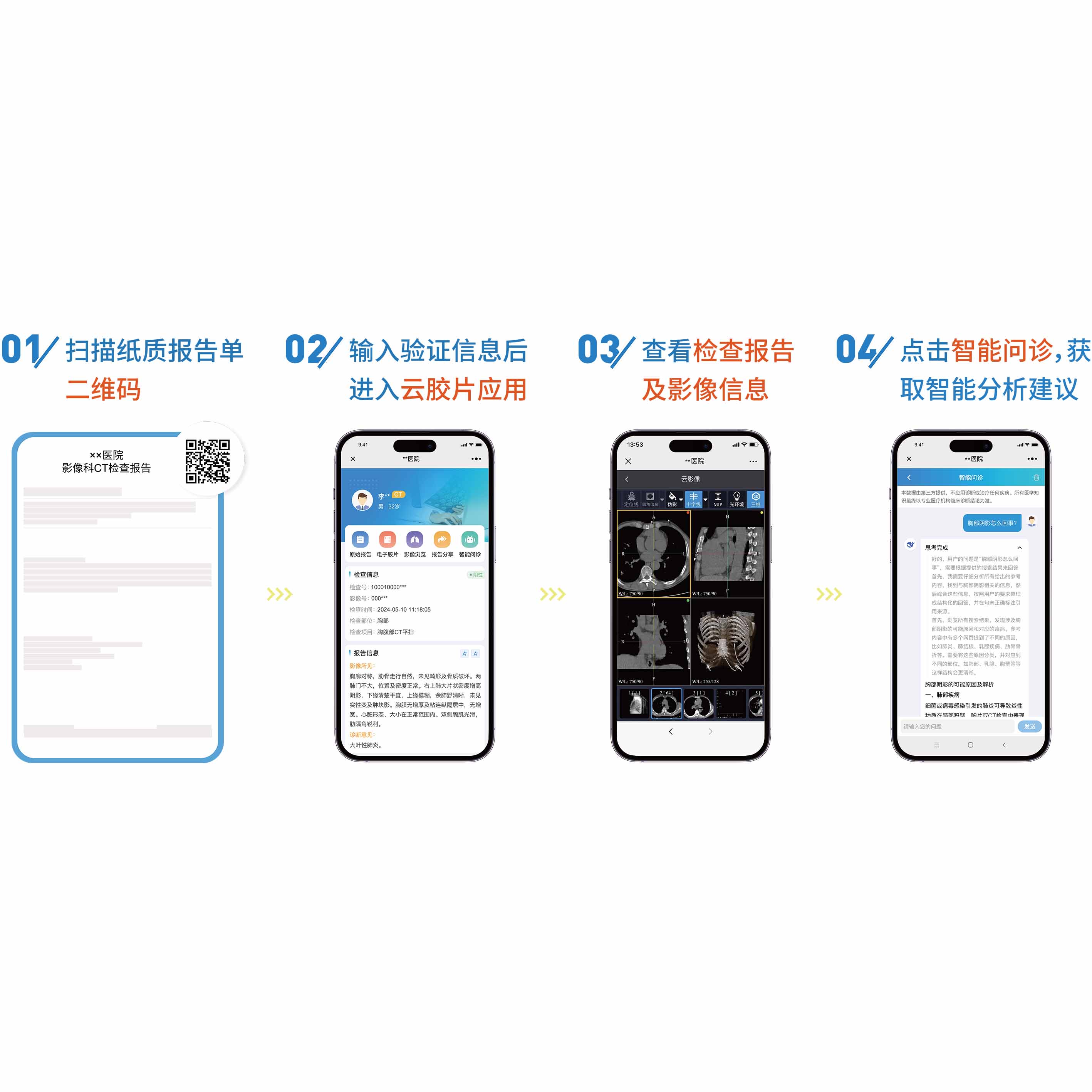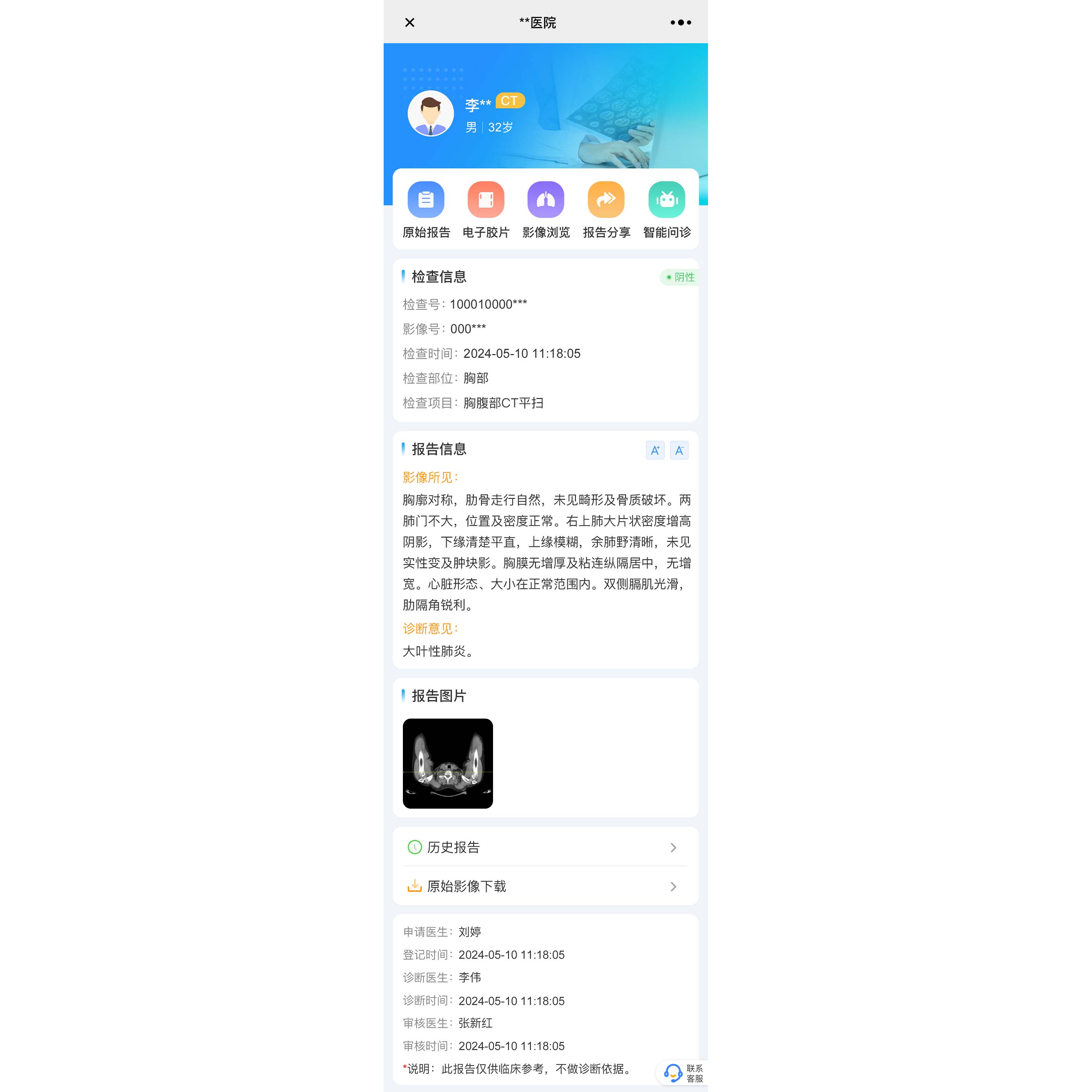 患者通过扫描报告单上的二维码,或者登录医院公众号等方式查看自己的报告以及全序列DICOM影像。除了自己查看外,患者还可分享给其他医生查看。支持对接DeepSeek,提供患者报告智能解读,让患者彻底告别“报告焦虑”。云胶片提供了基于PACS的多终端浏览界面,内含PACS的常用影像操作,方便医生进行移动调阅,大大提高了患者的就医体验,提升了医院的信息化建设水平。